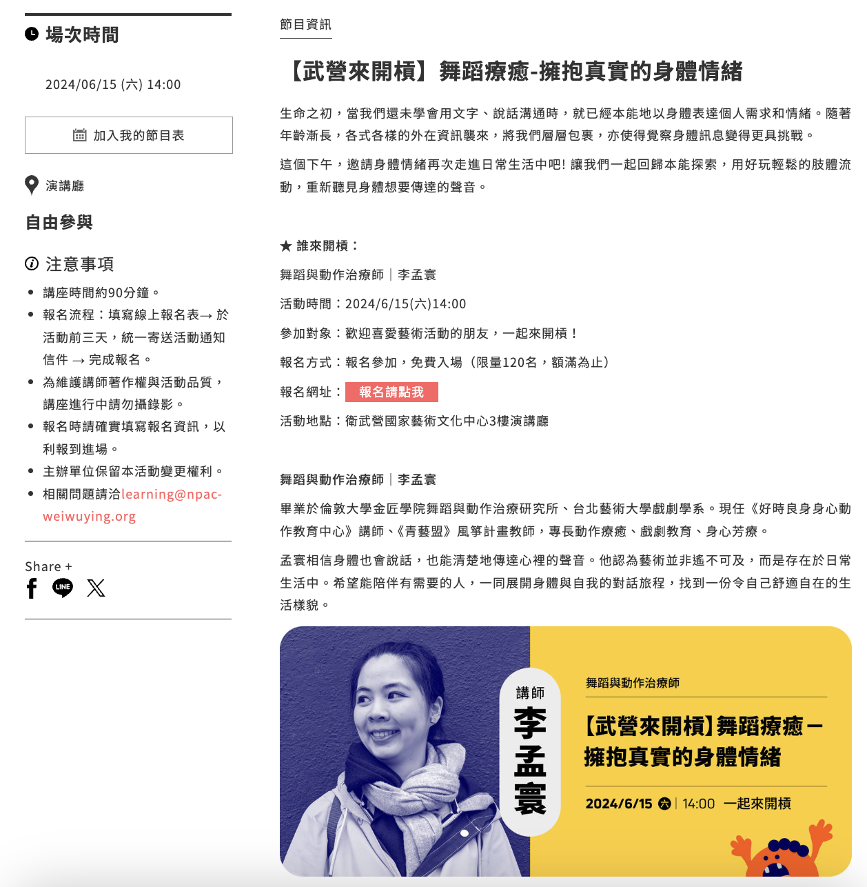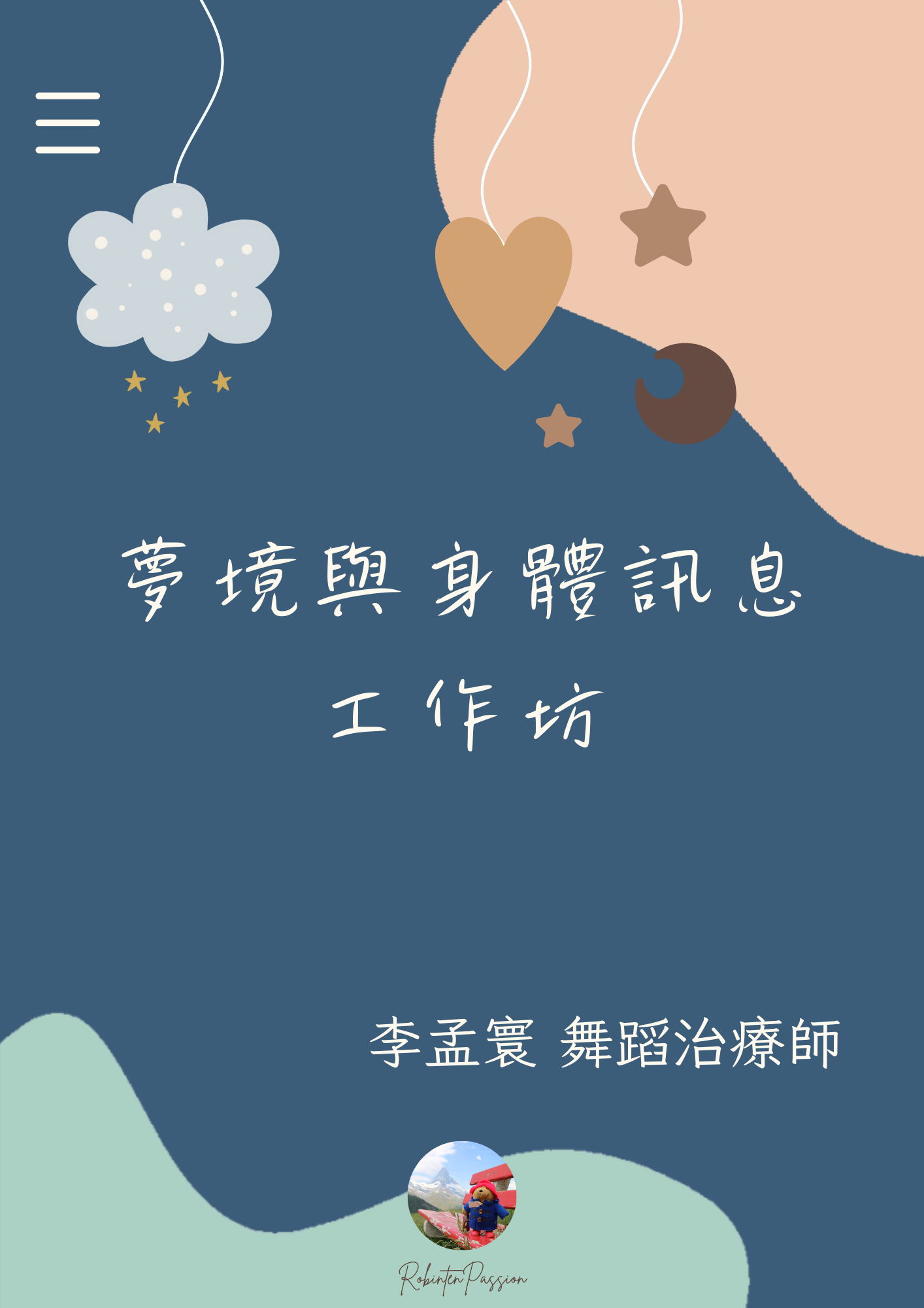 Hey, welcome to 傻傻過日子 Robinten Passion 嗨,我是舞蹈動作治療師,孟寰。在這裡,你可以找到:舞蹈動作治療、戲劇教育、植覺芳療的相關資源。如果你正在尋覓這些領域的講師,或是有講座需求,很歡迎來訊聊聊喔! 每盞燈下,都有一個故事。盼望每個故事,都能被溫柔承接。 藝術並非遙不可及,反之,它源於日常中所有微小之處。 孟寰行走過海洋彼方的一些山脈,徜徉過山脈背後的一點河海。工作之餘總在書寫,寫她所見、所想、所感受。她相信每盞燈下都有一個故事,盼望能用身體動作、音樂與芳療探索,陪伴相遇的人,打燈同行。 Read More 服務項目 無論是企業團體、各級公私學校,或醫療與身心診所,皆可提供客製化課程規劃: 舞蹈治療團體放下腦袋慣性,讓身體先行。舞蹈治療透過直覺動作、肢體覺察,邀請參與者經驗有覺知的身體與情緒。 在長期穩定的陪伴下, 提供成員身體表達與內在抒發支持, 也為關係與個人成長創造新的可能。 植覺芳療透過來自植物最溫柔與誠實的陪伴,與你一起梳理,生活中的不同面向。生活遇見小卡關、心情亂亂,或是單純想知道,精油會帶來什麼訊息與幫助嗎?植覺芳療,進來瞧瞧吧! 戲劇教育由具備表演藝術合格教師證的講師帶領,以好玩的劇場遊戲、肢體開發切入,邀請團體一窺劇場裡的創造與排練樣貌。參與者無需具備任何劇場專業知識,在這堂戲劇課裡,只需放心自在地玩耍、讓創造力飛翔! 體驗式講座無論是:個人成長、身心健康、舞蹈治療、戲劇教育,我們提供客製化體驗式講座。讓講座不只是單向靜態聆聽,而是親身經歷、實際體會的深刻時光! 芳香舞療工作坊芳療、舞療,一次滿足。簡易版植覺芳療,搭配身體覺察練習。在嗅聞植物氣息的同時,也靜下心,為自己做一次深度的內外整理。 舞藝療癒融合團體由舞蹈治療搭配藝術治療,兩項專業融合的團體。以雙講師帶領方式,創造宜動宜靜、有人際交流、也有個人時光的團體經驗。 學歷 Education 2016 - 2018 碩士 倫敦大學金匠學院舞蹈動作心理治療學系Goldsmiths, University of LondonMA Dance Movement Psychotherapy 2010 - 2014 合格教師 中等學校師資培育教育學程Secondary Teacher Education Program 2009 - 2014 學士 國立臺北藝術大學戲劇學系 劇本創作組Taipei National University of the Arts Department of Theatre Arts 專業經歷 Experience 2023 to present 共同創辦人Co-Founder 島海工作室島海工作室共同創辦人,以舞蹈治療搭配藝術治療,雙講師方式,為社會大眾提供創造性療癒工作坊。 > 2023《島海靈魂》舞藝療癒年末工作坊 > 2024《島海女人》舞藝療癒計畫 2023 - 2024 兼任講師Adjunct Instructor 台北市立大學 舞蹈系 舞蹈治療課程以理論與實作同時進行的方式,帶領大學部三年級以上之學生,認識舞蹈動作治療,並嘗試設計、模擬帶領團體。 2018 - 2019 表演藝術教師 國立新竹科學園區實驗高級學校 雙語部 以中英雙語教授七至九年級、十二年級學生表演藝術相關課程。教學內容包含:肢體潛能開發、遊戲與律動、人際互動、劇場專業知識與實作等。 > 教案設計與撰寫 > 大型表演節目設計與指導 > 參與WASC教育認證計畫之執行 點我看詳細專業經歷 過往課程 / 工作坊 《跳動的記憶》舞蹈處方箋 衛武營國家藝術文化中心【武營來開槓】 直覺芳療講座 夢境與身體訊息工作坊